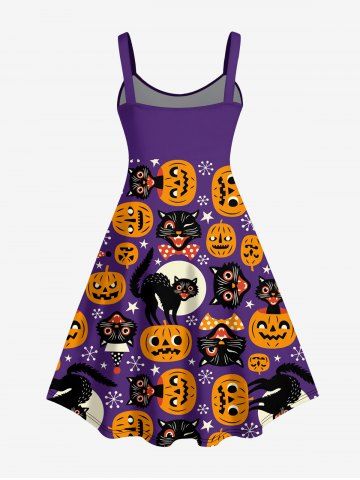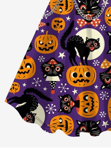 Plus Size Halloween Pumpkin Cat Grommets Chains 3D Print Tank Dress - Purple - S