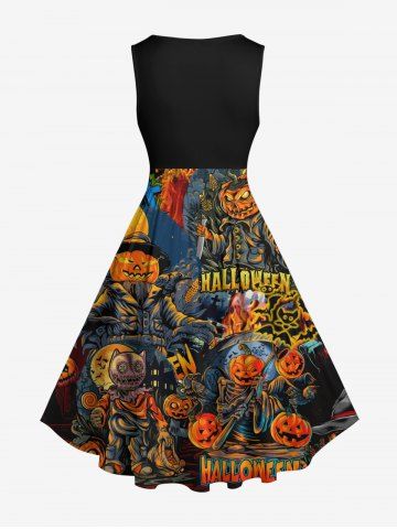 Plus Size Halloween Pumpkin Fire Flame Skulls Moon Print 1950s Vintage Dress - Black - L