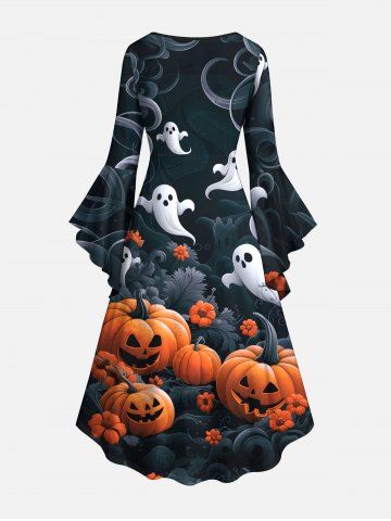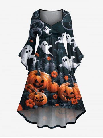Halloween Dresses > Plus Size Halloween Pumpkin Ghost Flowers Print Ruched Flare Sleeves High Low Dress