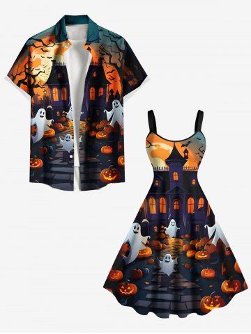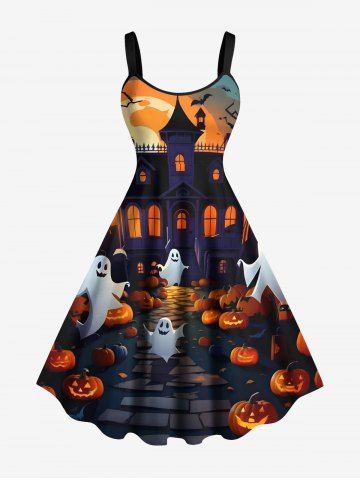 Halloween Dresses > Plus Size Halloween Pumpkin Ghost Moon Bat Tree Print Tank Dress