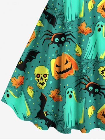 Plus Size Halloween Pumpkin Ghost Skulls Spider Bat Maple Leaf Print Tank Dress - Green - 4x