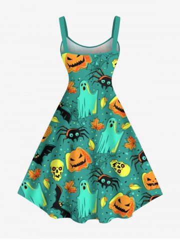 Plus Size Halloween Pumpkin Ghost Skulls Spider Bat Maple Leaf Print Tank Dress - Green - 5x