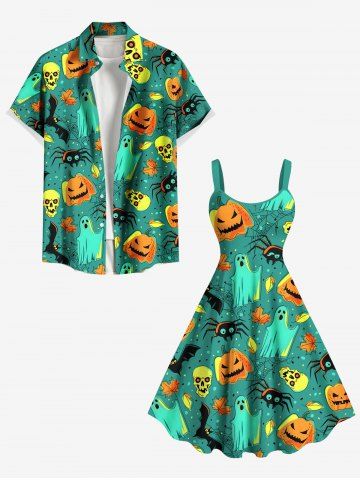 Plus Size Halloween Pumpkin Ghost Skulls Spider Bat Maple Leaf Print Tank Dress - Green - 6x