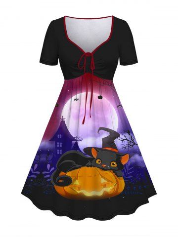 Plus Size Halloween Pumpkin Hat Cat Moon Tree Print Cinched Dress - Purple - 2x
