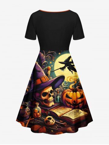 Plus Size Halloween Pumpkin Hat Skull Moon Book Print Cinched Dress - Black - Xs