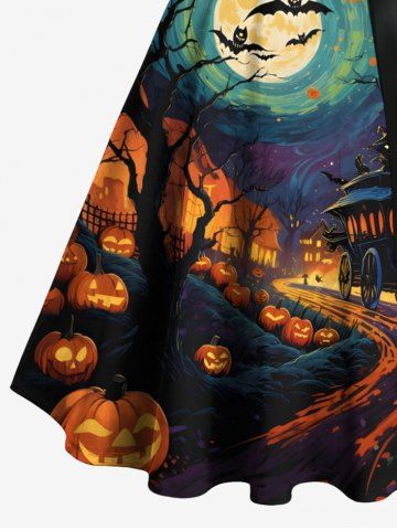 Plus Size Halloween Pumpkin Lantern Bat Moon Print Buttons Turn Down Collar Dress With Belt - Black - 3x