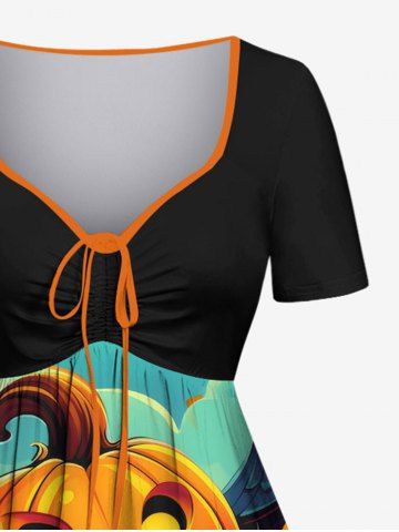 Plus Size Halloween Pumpkin Lantern Castle Print Cinched Dress - Black - 1x