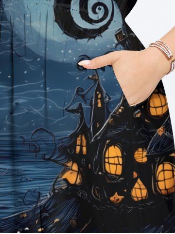 Plus Size Halloween Pumpkin Lantern Moon Print Split Midi Dress - Black - Xs