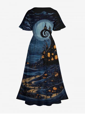 Plus Size Halloween Pumpkin Lantern Moon Print Split Midi Dress - Black - 6x