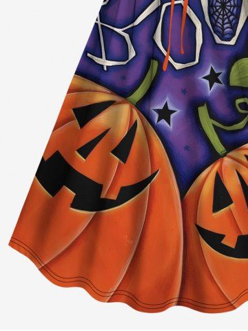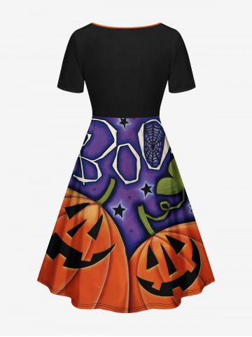 Plus Size Halloween Pumpkin Leaf Star Spider Web Print Cinched Dress - Black - S