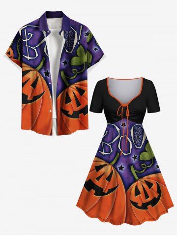 Plus Size Halloween Pumpkin Leaf Star Spider Web Print Cinched Dress - Black - 1x