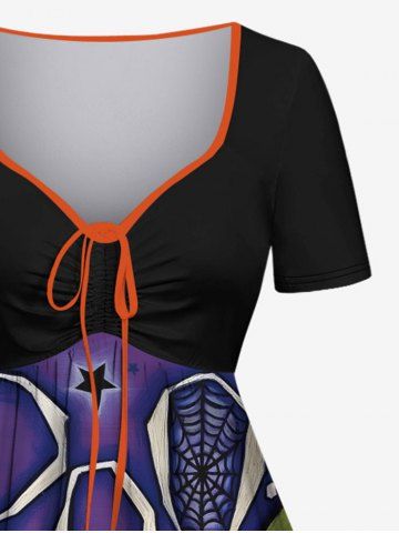 Plus Size Halloween Pumpkin Leaf Star Spider Web Print Cinched Dress - Black - 3x