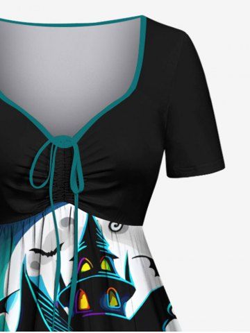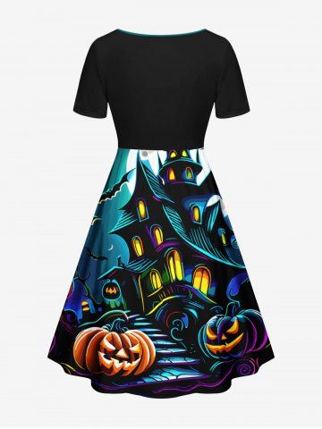 Plus Size Halloween Pumpkin Moon Bat Castle Print Cinched Dress - Black - 5x