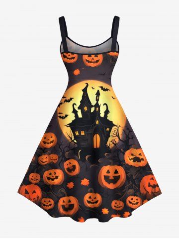 Plus Size Halloween Pumpkin Moon Bat Castle Print Tank Dress - Orange - S