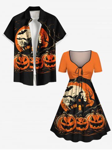 Halloween Dresses > Plus Size Halloween Pumpkin Moon Bat Tree Print Cinched Dress