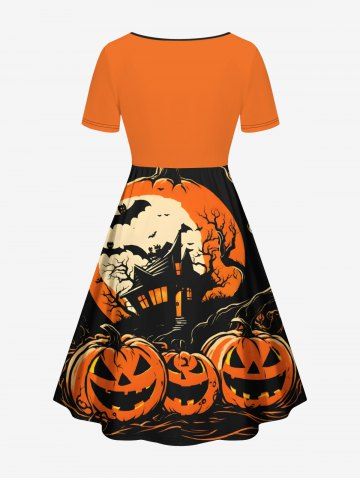 Plus Size Halloween Pumpkin Moon Bat Tree Print Cinched Dress - Orange - 3x