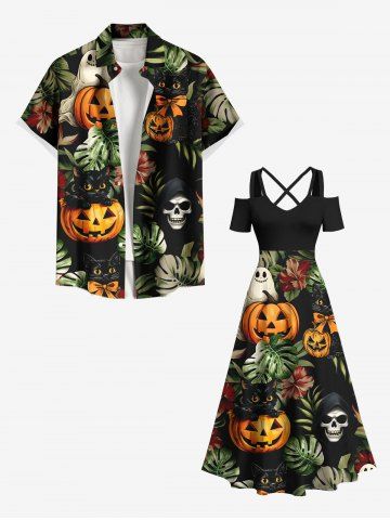 Plus Size Halloween Pumpkin Skull Cat Tropical Leaf Flowers Print Cold Shoulder Crisscross Hawaii Maxi Dress - Black - S