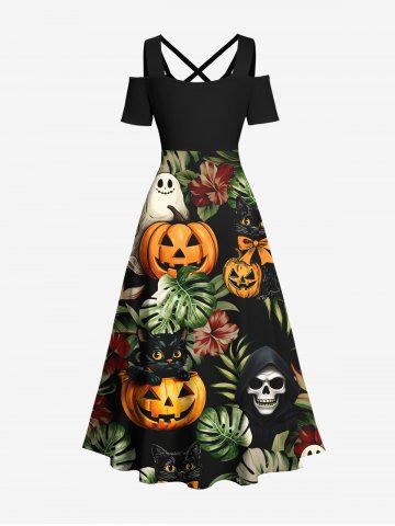 Plus Size Halloween Pumpkin Skull Cat Tropical Leaf Flowers Print Cold Shoulder Crisscross Hawaii Maxi Dress - Black - 6x