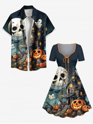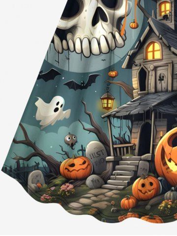 Plus Size Halloween Pumpkin Skull Ghost Bat Print Cinched Dress - Deep Green - S