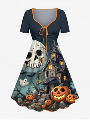 Plus Size Halloween Pumpkin Skull Ghost Bat Print Cinched Dress - Deep Green - 4x