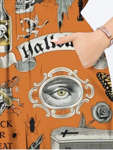 Plus Size Halloween Pumpkin Skull Owl Spider Web Butterfly Clock Eagle Print Split Midi Dress - Orange - M