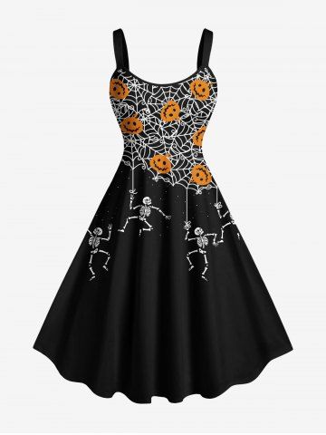 Plus Size Halloween Pumpkin Spider Web Skeleton Print Tank Dress - Black - 3x