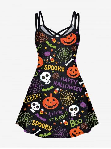 Halloween Dresses > Plus Size Halloween Pumpkin Spider Web Skull Print Crisscross Cami Dress