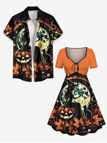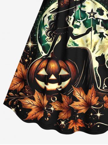 Halloween Dresses > Plus Size Halloween Pumpkin Wizard Cat Maple Leaf Moon Print Cinched Dress