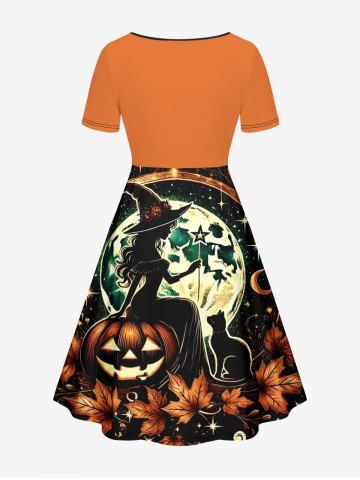 Plus Size Halloween Pumpkin Wizard Cat Maple Leaf Moon Print Cinched Dress - Orange - 5x