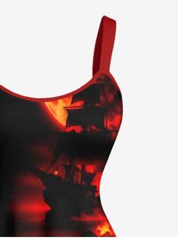 Plus Size Halloween Skull Pirate Sea Waves Ship Fire Flame Print Tank Dress - Black - S