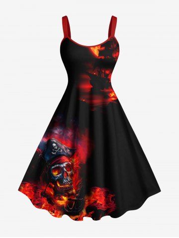 Halloween Dresses > Plus Size Halloween Skull Pirate Sea Waves Ship Fire Flame Print Tank Dress