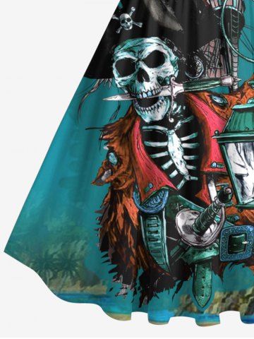 Halloween Dresses > Plus Size Halloween Skull Pirate Ship Lantern Print 1950s Vintage Dress