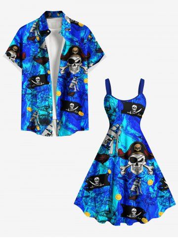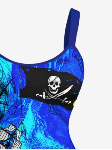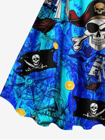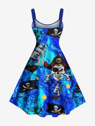 Plus Size Halloween Skull Pirate Ship Rudder Cruise Print Tank Dress - Sky Blue - 3x