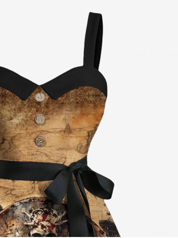 Plus Size Halloween Skull Pirated Ship Rudder Print Buttons Turn Down Collar Dress With Belt - Brown - M