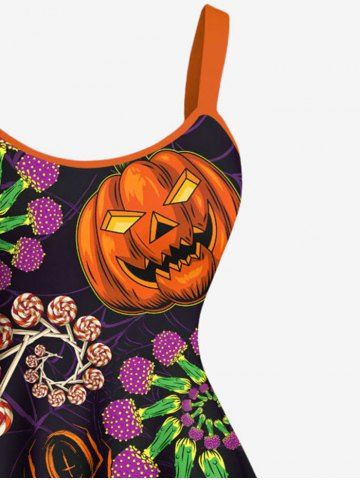 Plus Size Halloween Skull Pumpkin Flowers Spider Print Tank Dress - Black - S