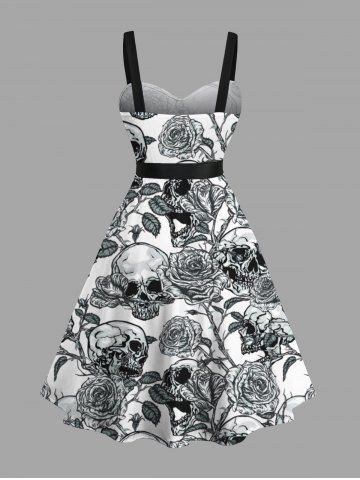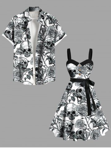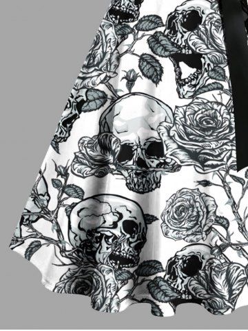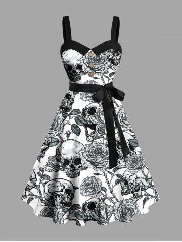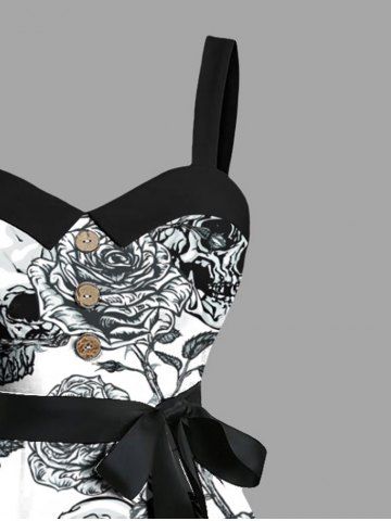 Plus Size Halloween Skull Rose Flowers Print Buttons Turn Down Collar Hawaii Dress With Belt - Black - Xs