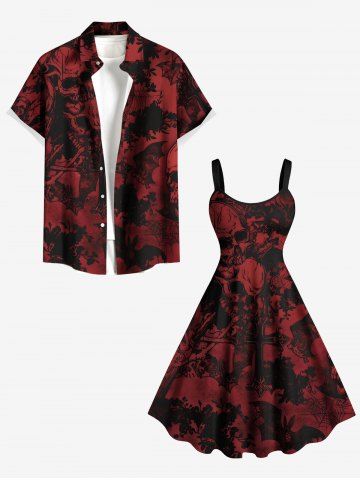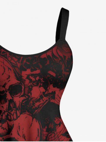 Plus Size Halloween Skulls Cross Spider Web Bat Print Tank Dress - Red Wine - S