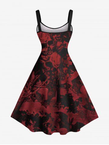 Plus Size Halloween Skulls Cross Spider Web Bat Print Tank Dress - Red Wine - 5x