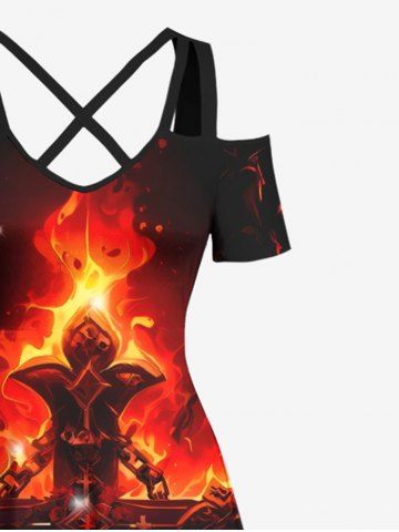 Plus Size Halloween Skulls Fire Flame Rose Flower Cross Print Cold Shoulder Crisscross Maxi Dress - Red - 3x