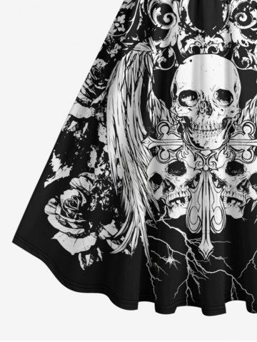 Plus Size Halloween Skulls Flowers Wings Print 1950s Vintage Dress - Black - 5x