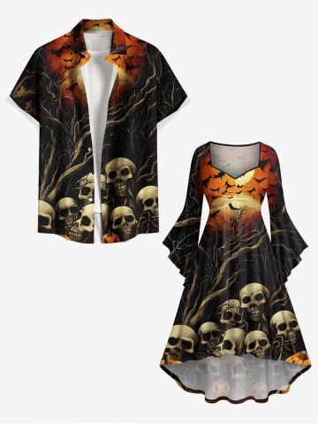 Halloween Dresses > Plus Size Halloween Skulls Pumpkin Bat Moon Tree Print Flare Sleeves High Low Dress