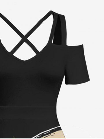 Plus Size Halloween Skulls Rose Flowers Print Cold Shoulder Crisscross Maxi Dress - Black - 6x