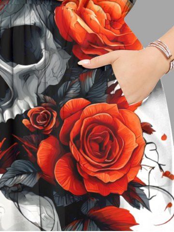 Halloween Dresses > Plus Size Halloween Skulls Rose Flowers Print Split Midi Dress