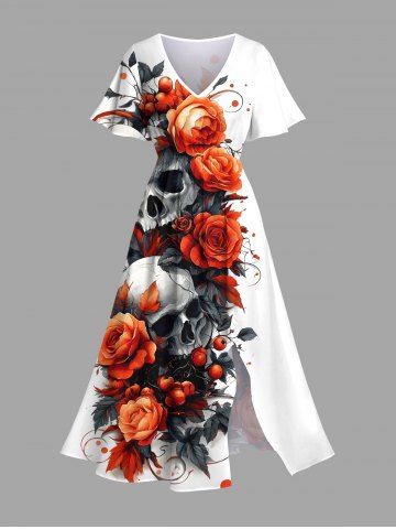 Plus Size Halloween Skulls Rose Flowers Print Split Midi Dress - White - 2x