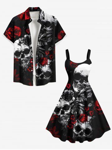 Halloween Dresses > Plus Size Halloween Skulls Rose Flowers Print Tank Dress