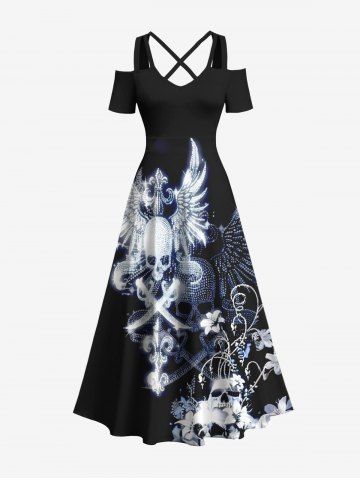 Plus Size Halloween Skulls Wings Flowers Print Cold Shoulder Crisscross Maxi Dress - Black - 5x