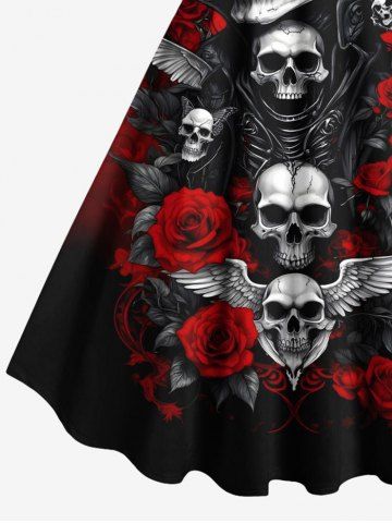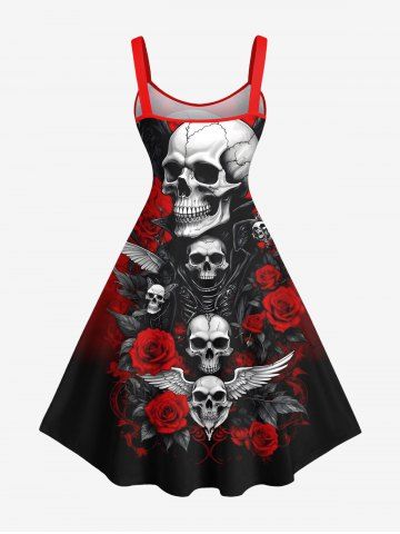 Plus Size Halloween Skulls Wings Rose Flowers Butterfly Print Tank Dress - Black - 5x