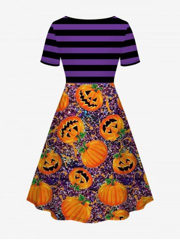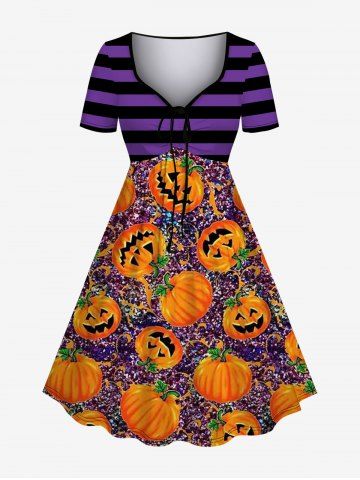 Halloween Dresses > Plus Size Halloween Stripes Pumpkin Sparkling Sequin 3D Print Cinched Dress