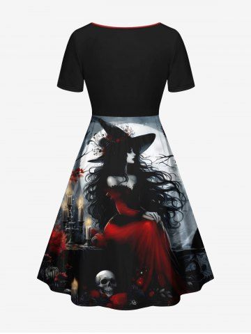 Plus Size Halloween Wizard Skulls Candles Owl Moon Print Cinched Dress - Black - L