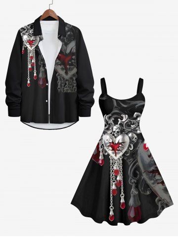 Halloween Dresses > Plus Size Metallic Skull Cracked Heart Chain Tassel Print Halloween Costume A Line Tank Dress